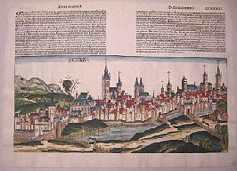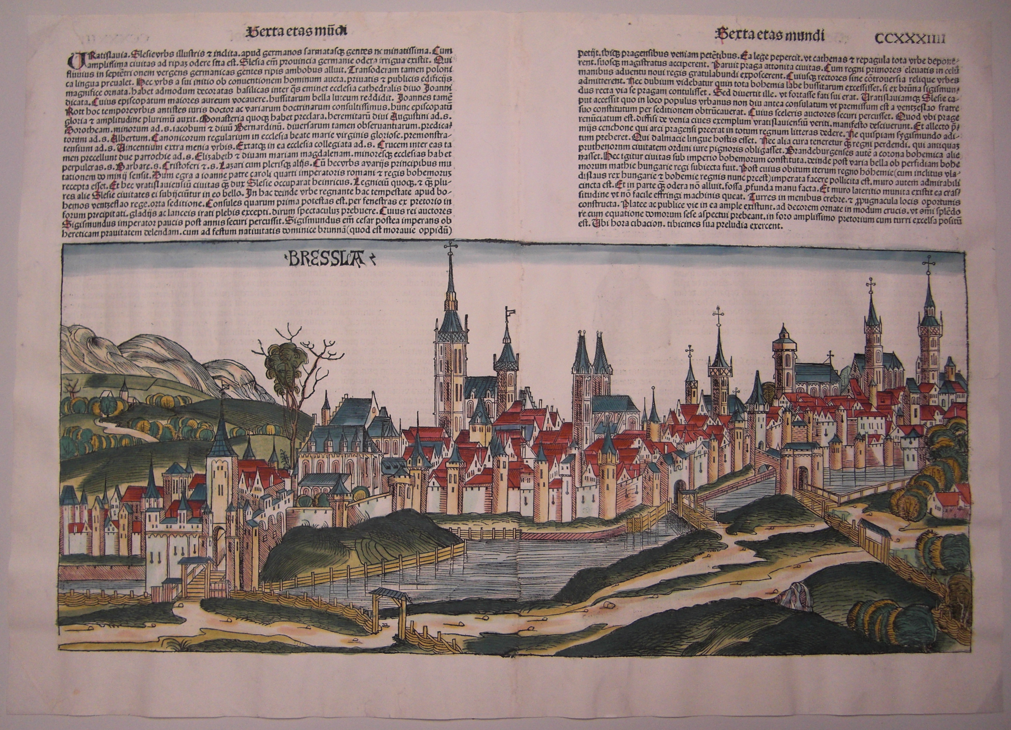 Kolorierte, doppelseitige Stadtansicht Breslau aus der Schedel’schen Weltchronik aus dem Jahre 1493, lateinische Ausgabe. Blatt CCXXXIIII.
