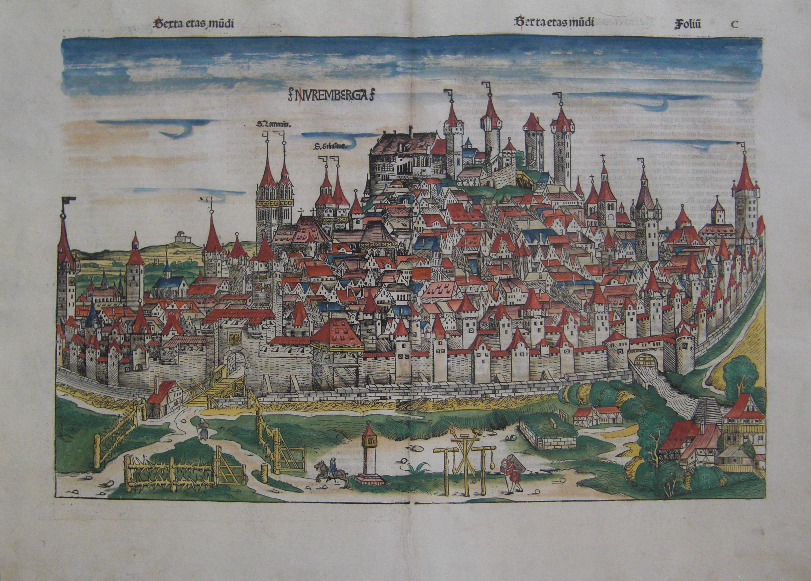Älteste detailgetreue Abbildung der Reichsstadt Nürnberg überhaupt und mit 53cm x 34,5cm die größte der Schedel Chronik. Die Ansicht erfaßt das Stadtbild von Süden her und bietet somit den besten Blick auf den imposanten Burgberg. Über dem doppelten Mauerring im Vordergrund erheben sich die Häuser, welche in der Silhouette der beiden doppeltürmigen Hauptkirchen Nürnbergs, St. Lorenz und St. Sebald gipfeln.