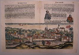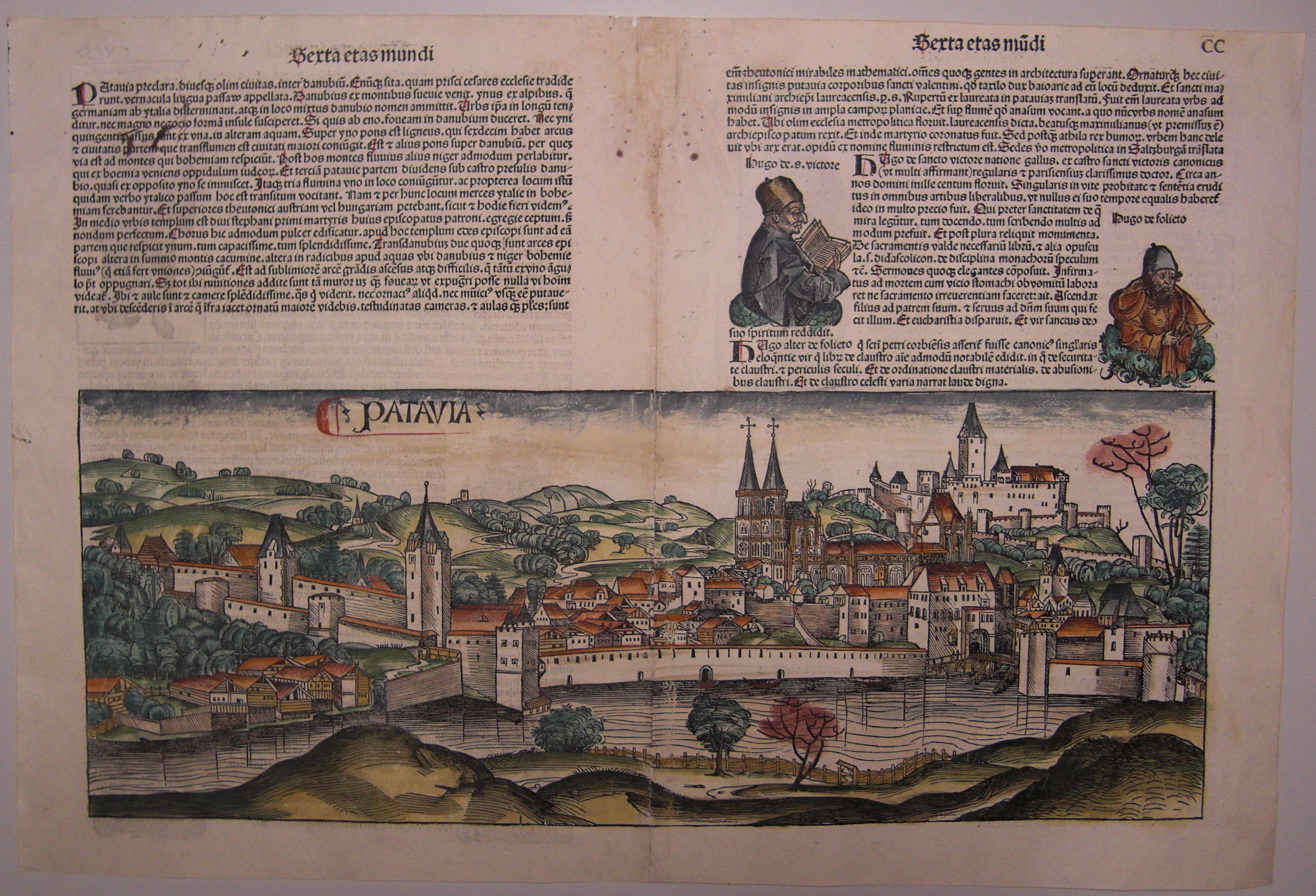 Altkolorierte, doppelseitige Stadtansicht Passau aus der Schedel’schen Weltchronik aus dem Jahre 1493, lateinische Ausgabe. Blatt CC.