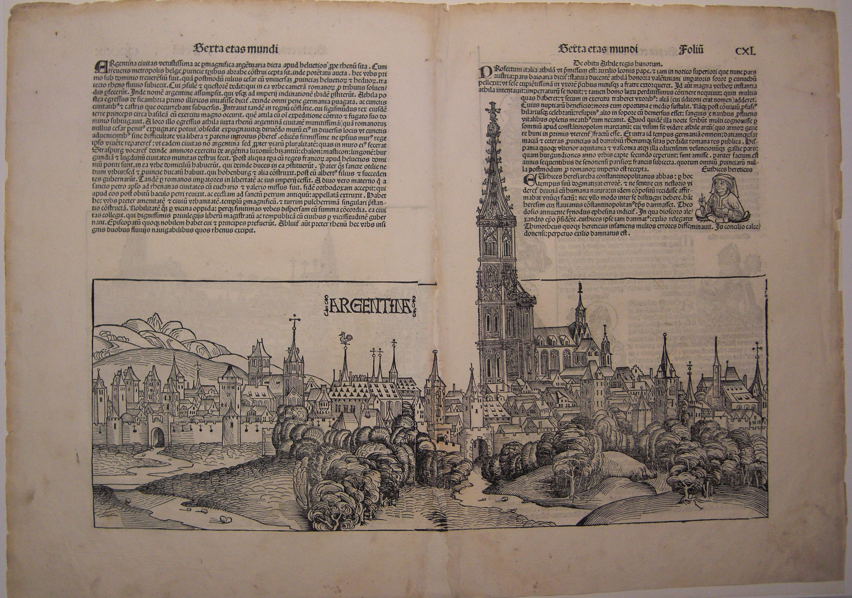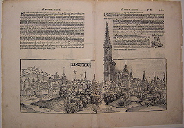 Doppelseitige Stadtansicht Straßburg aus der Schedel’schen Weltchronik aus dem Jahre 1493, lateinische Ausgabe. Blatt CXL, schwarz/weiß