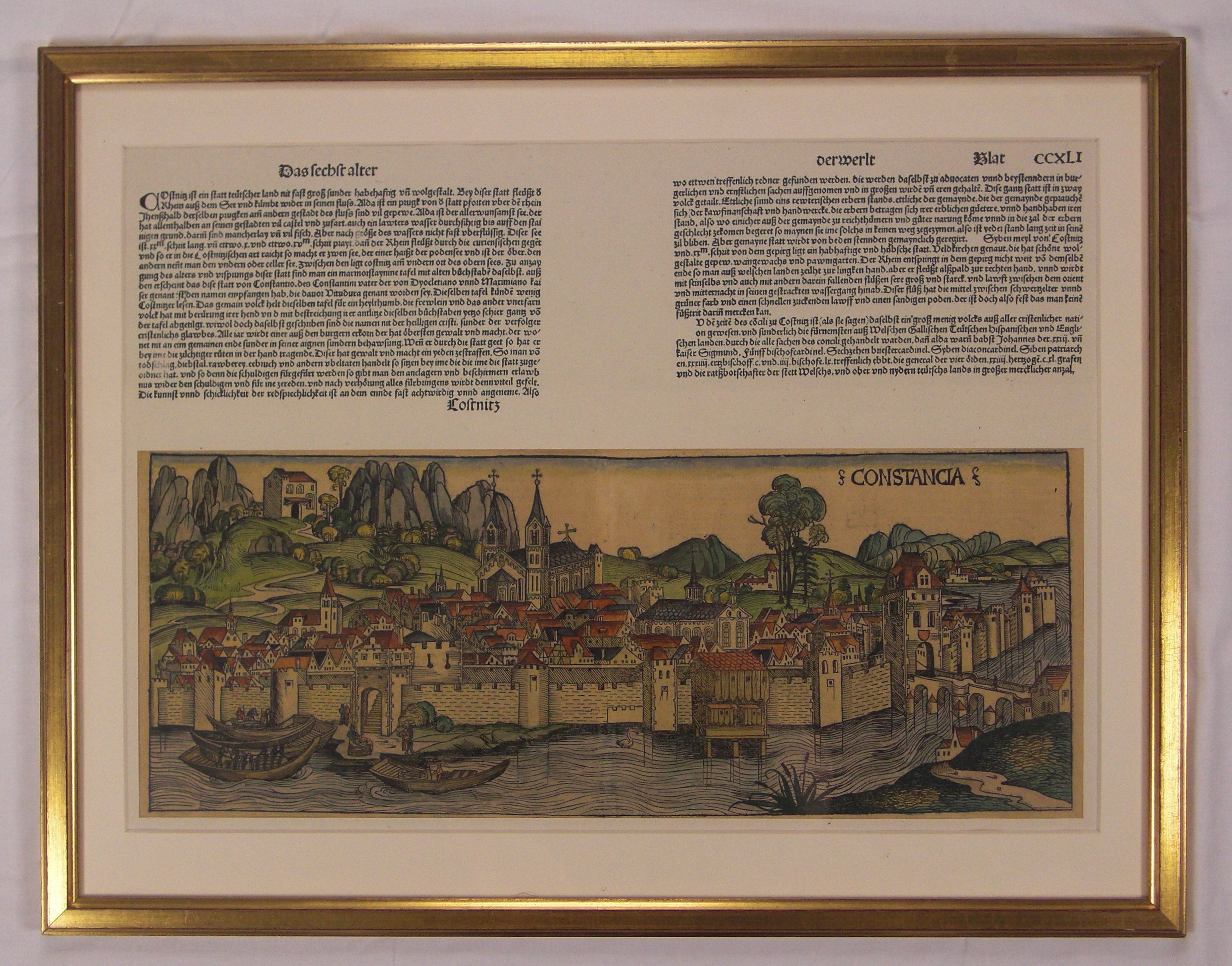 Der darüber befindliche Text stammt aus einem Nachdruck und wurde als Seite (Faksimile-Ansicht ausgeschnitten) über die originale Stadtansicht (20cm x 52cm) gelegt.