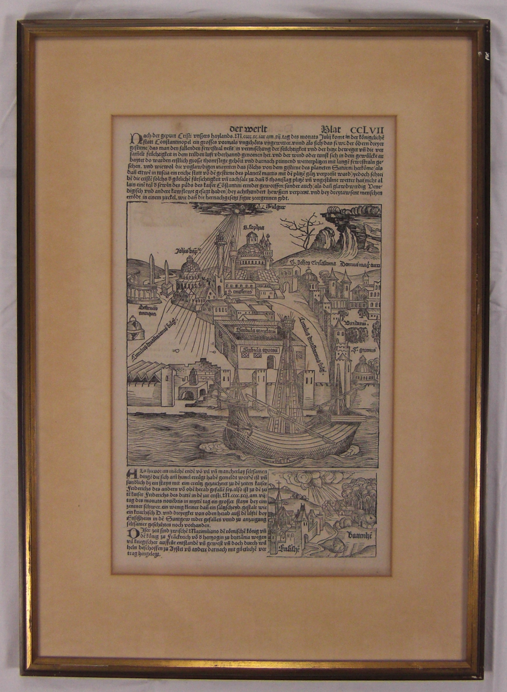 Blatt CCLVII aus der deutschen Ausgabe der Schedel’schen Weltchronik von 1493, schwarz/weiß. Recto: „Phantasieansicht Konstantinopel vom Meer aus gesehen“.