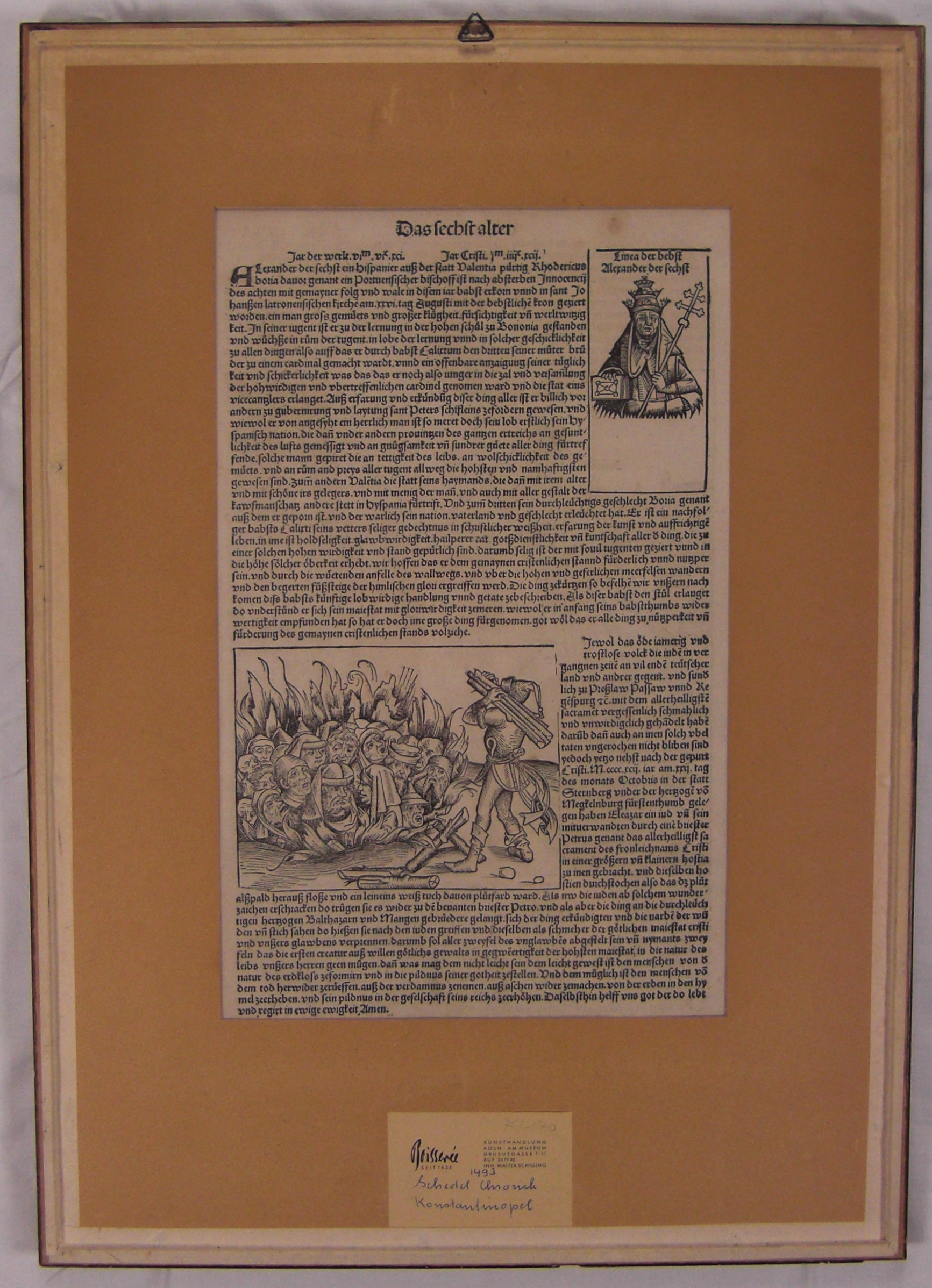 Verso zwei weitere Holzschnitte „Papst Alexander VI.“ und „Ketzerverbrennung“.
