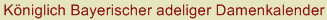 Der königlich bayerischer adeliger Damenkalender enthielt eine Übersicht der Genealogie des Hauses Wittelsbach, Bezeichnung von Trägern der bedeutendsten bayerischen Orden (u.a. des Theresien- und Elisabethordens, Hubertusorden), Verzeichnisse der damals in München wohnhaften Mitglieder des höheren Adels, Namenslisten des diplomatischen Korps, sowie eine Einteilung des hoffähigen einheimischen Damen in erster bis dritter Klasse. Ein "who is who" und Nachschlagewerk aus der Zeit der Monarchie.
