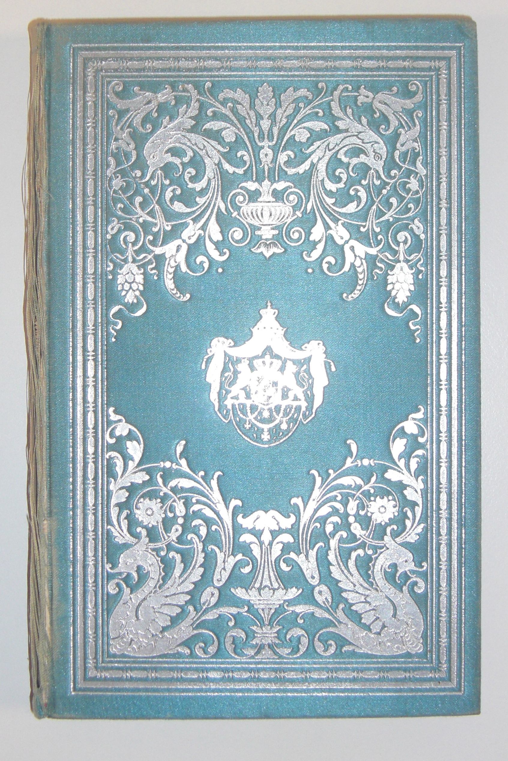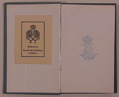Hellblauer, silbergeprägter Seideneinband, Buchrücken leicht bestoßen und ausgefranst, Silberschnitt. Auf der Vorderseite das Wappen der bayerischen Königsfamilie. Innenseite mit dem gemeinschaftlichen Ex Libris "Bibliothek Paz und Ludwig Ferdinand von Bayern", daneben Monogramm mit Königskrone (vermutlich Monogram des Prinzen Alfons von Bayern).