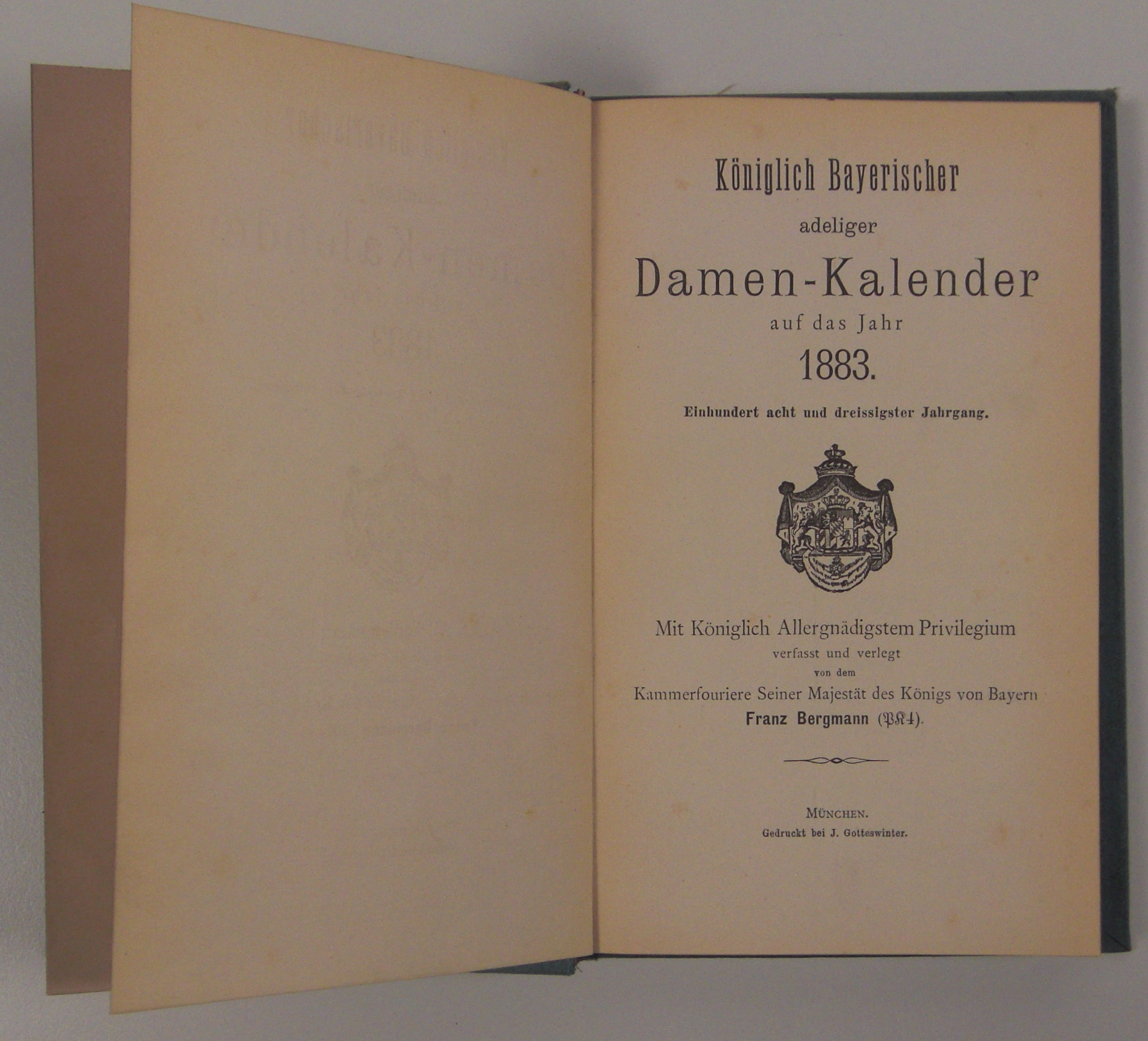 Prunkausgabe "Königlich Bayerischer adeliger Damenkalender" aus dem persönlichem Besitz des Prinzen Prinz Ludwig Ferdinand und seiner Frau Prinzessin Maria de la Paz, Infantin von Spanien aus dem Jahre 1883.