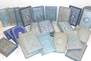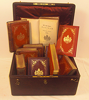 35 Prunkausgaben "Königlich Bayerischer adeliger Damenkalender" aus dem persönlichem Besitz des Prinzen Ludwig Ferdinand und seiner Frau Prinzessin Maria de la Paz, Infantin von Spanien aus den Jahren 1880, 1881, 1883, 1885-1890, 1892-1913 sowie 1915-1918. Hellblaue, silbergeprägte Seideneinbände, die Rücken teilweise ausgebleicht, etwas bestoßen, Silberschnitt. Auf der Vorderseite das Wappen der bayerischen Königsfamilie. Jede Ausgabe am Einband innen mit dem gemeinschaftlichen Ex Libris "Bibliothek Paz und Ludwig Ferdinand von Bayern."