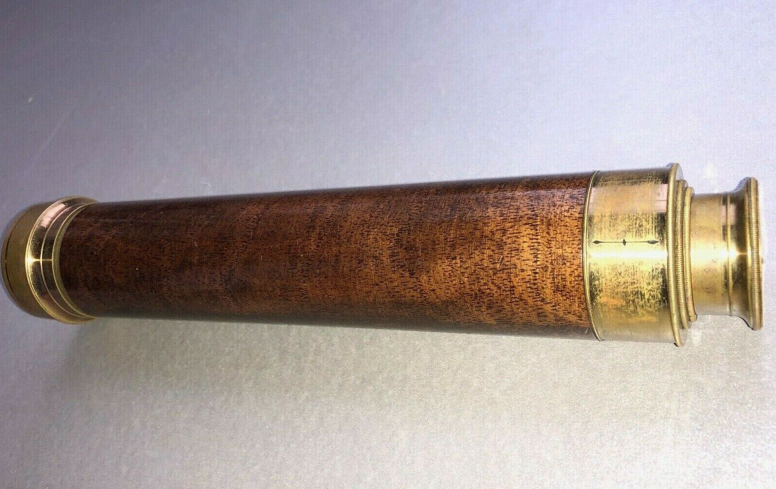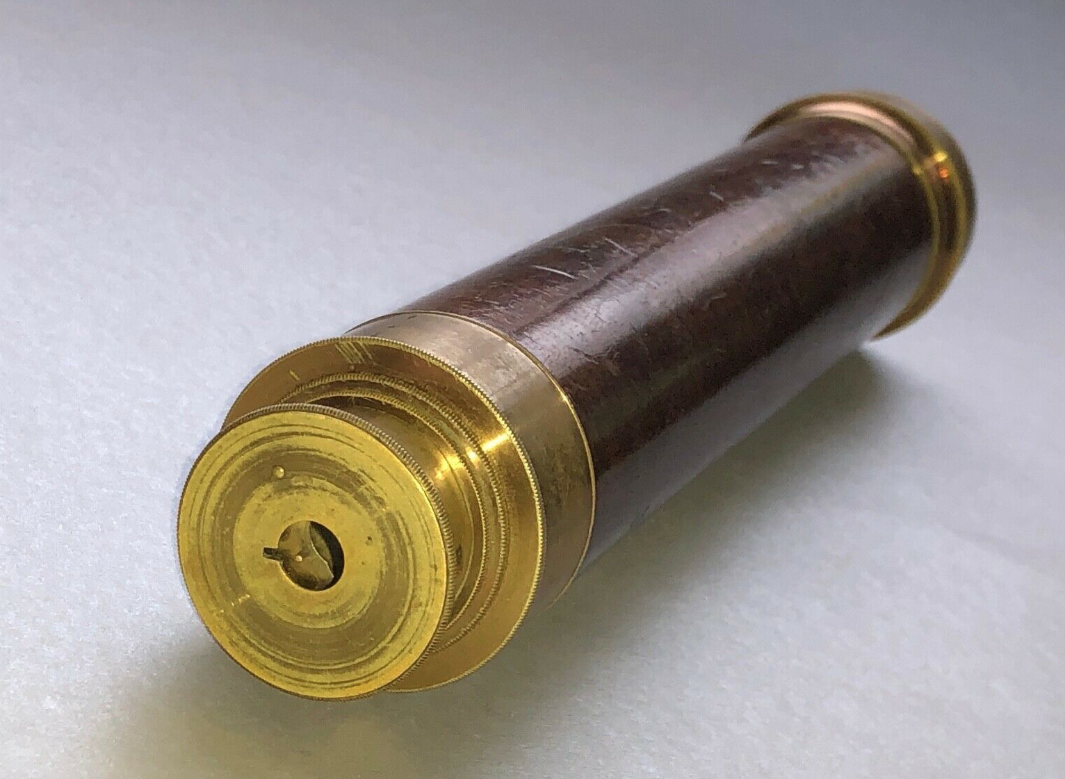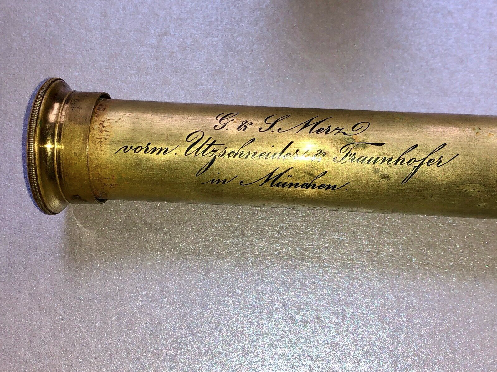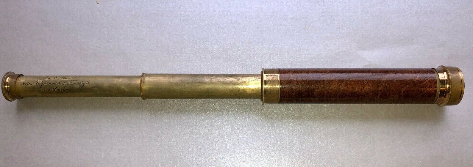 Hergestellt um 1860 in München, Herstellerbezeichnung "G. & S. Merz - vorm. Utzschneider & Fraunhofer in München". Dreischübiges Fernrohr aus Messing mit Resten von Vergoldung. Dunkelbraune Nusswurzel-Handhabe. Die Linsen des Fernglasses sind leicht verschmutzt.
