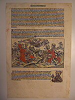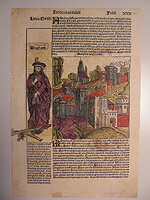 Einzelblatt XXII aus der lateinischen Ausgabe der Schedel’schen Weltchronik von 1493, altkoloriert. Titel: „Opferung Isaaks“, Anfangsbuchstaben rubriziert. Verso großer Holzschnitt mit der Darstellung der Opferung Isaaks 12,5cn x22,5cm. Recto Holzschnitt Abrahams und Phantasieansicht von Memphis. Guter Gesamtzustand.