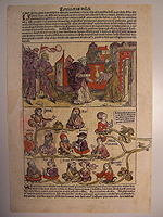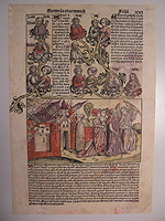 Einzelblatt XXI aus der lateinischen Ausgabe der Schedel’schen Weltchronik von 1493, koloriert. Recto Holzschnitt „Sodom und Gomorrah“, 22,5cm x 12,5cm.