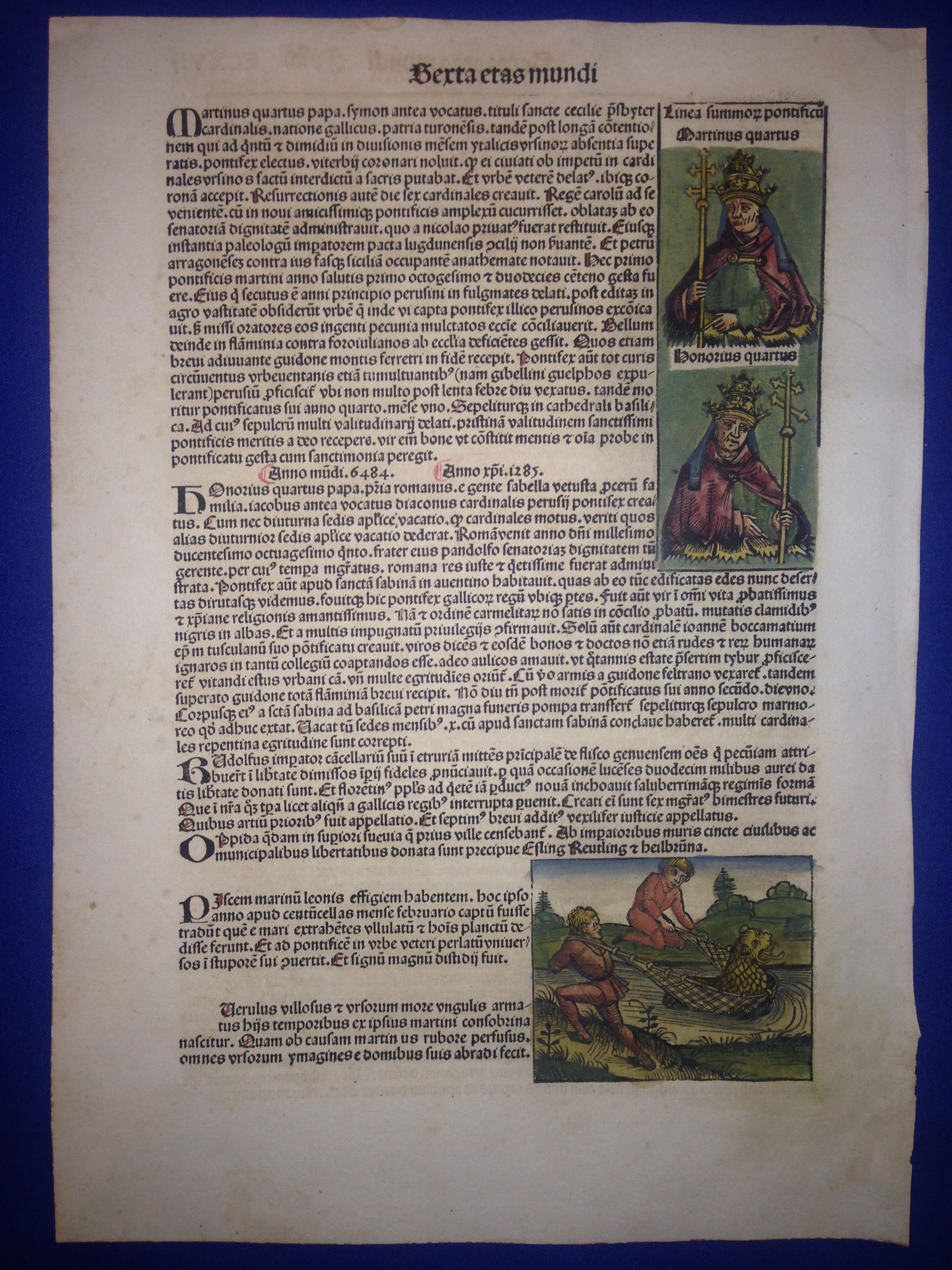 Einzelblatt CCXVII aus der lateinischen Ausgabe der Schedel’schen Weltchronik von 1493, koloriert. Titel: „Versehgang“.